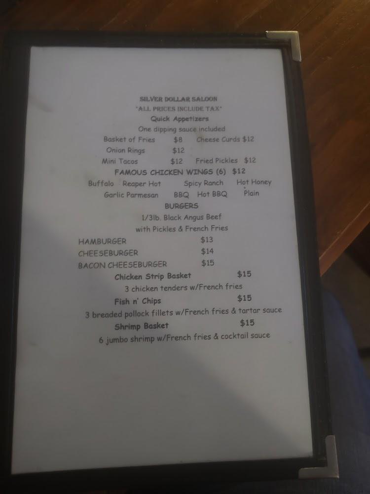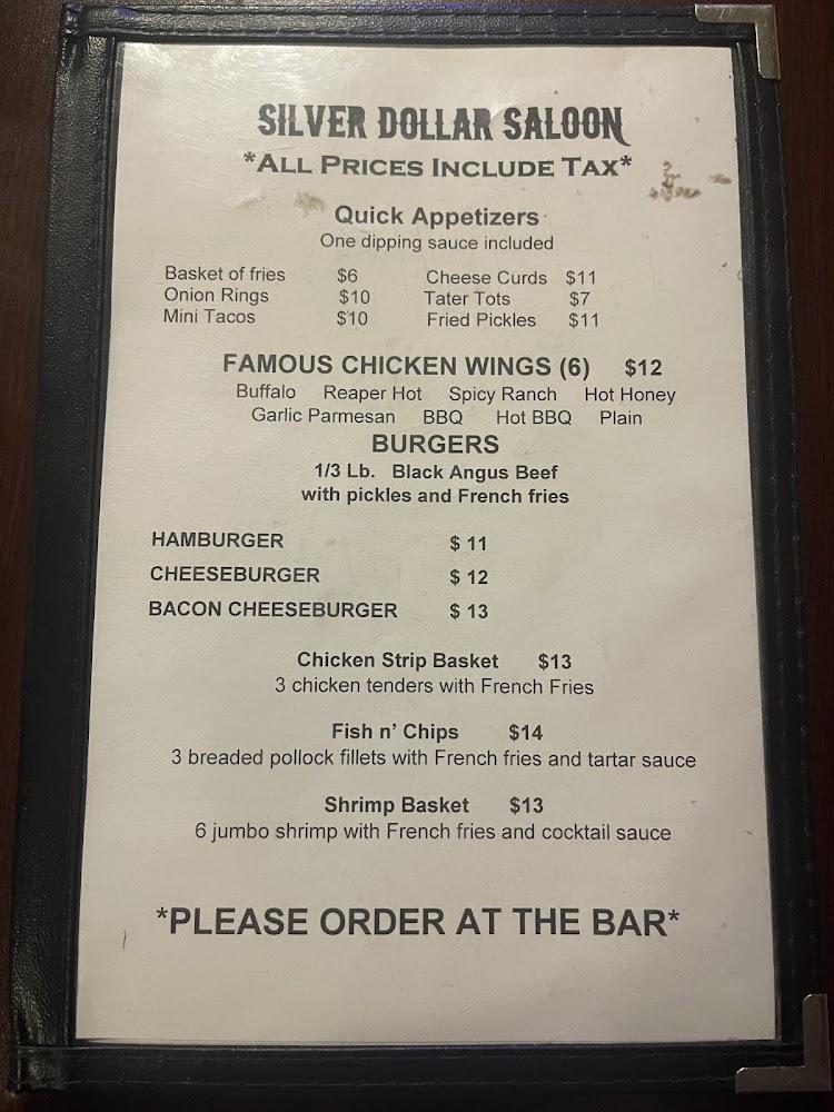 The menu at Silver Dollar Saloon features a delightful mix of bar food. Quick appetizers heat up the start to any meal; think fries, cheese curds, and fried pickles. When hunger strikes, the burgers, including the classic cheeseburger and bacon cheeseburger, are satisfying choices.